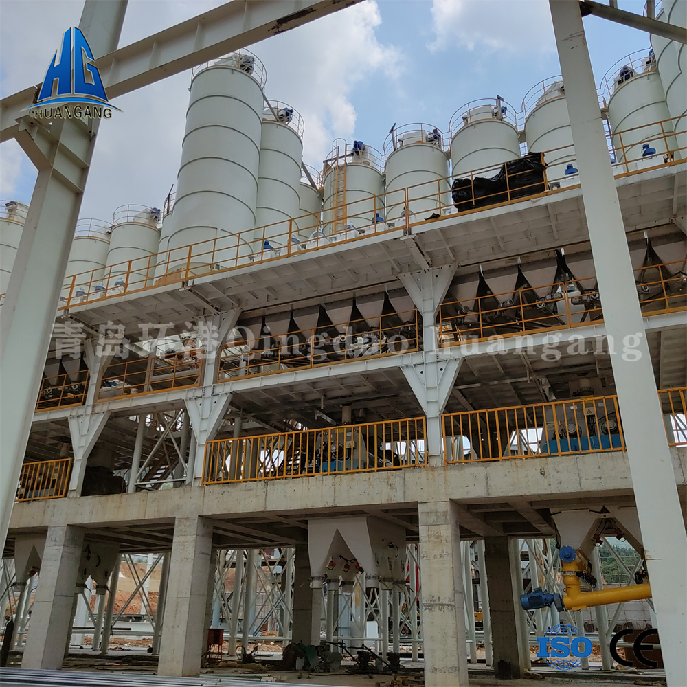 年產(chǎn)兩萬噸左右的砂漿生產(chǎn)線,一般情況下會用到3-6個原料罐,其中兩個大罐用于裝放散裝水泥和粉煤灰,其余小罐用于裝放輕鈣、重鈣、砂等。散裝水泥和粉煤灰進罐不需要提升設(shè)備,依靠泵車打入。散裝粉煤灰倉一般為圓筒支架結(jié)構(gòu),其上部有除塵設(shè)備,防止粉塵泄漏,下部裝有破拱裝置,防止粉料結(jié)塊,使粉料卸出順暢,并裝有料位傳感設(shè)備,可隨時掌握倉內(nèi)物料使用情況。