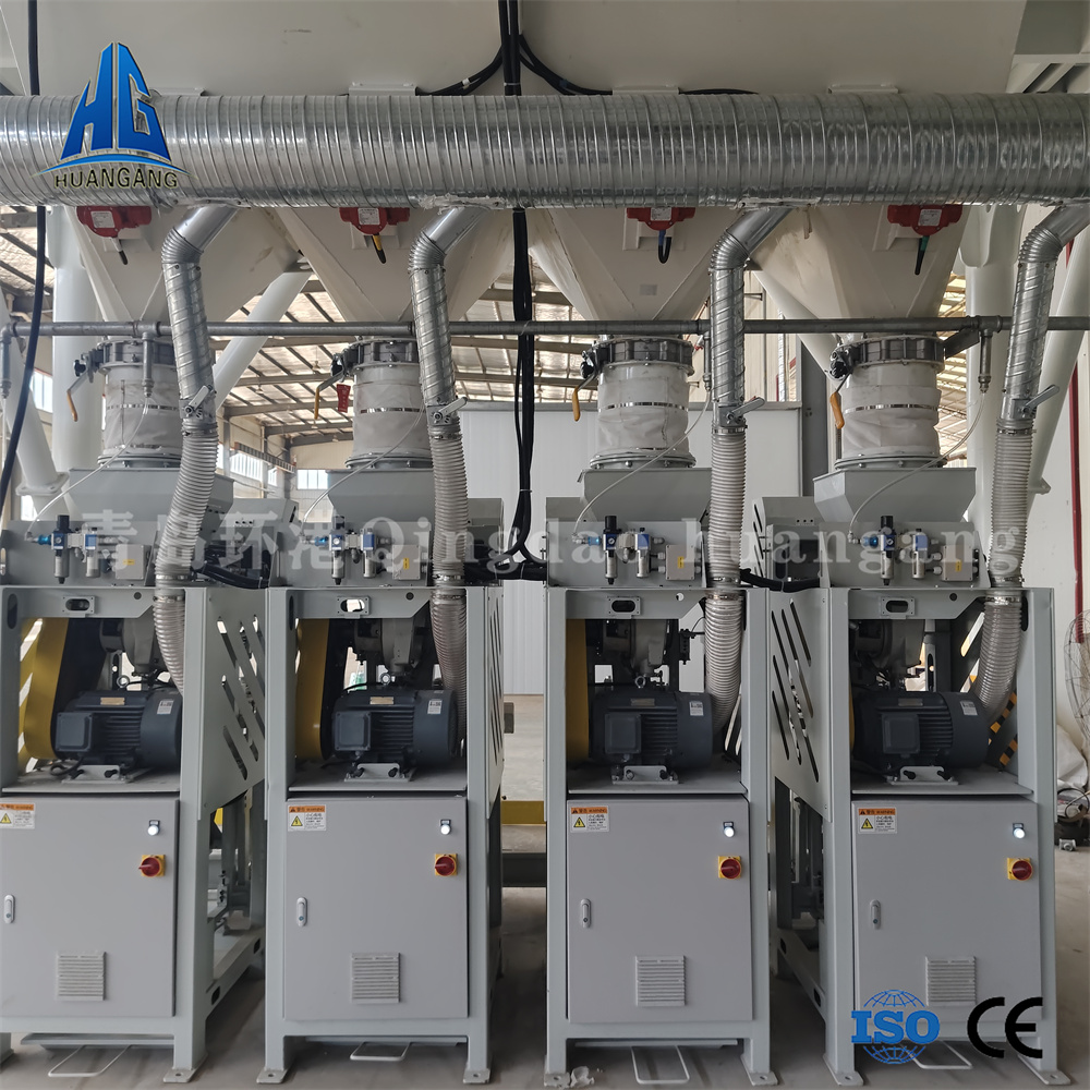 年產(chǎn)兩萬噸左右的砂漿生產(chǎn)線,一般情況下會用到3-6個原料罐,其中兩個大罐用于裝放散裝水泥和粉煤灰,其余小罐用于裝放輕鈣、重鈣、砂等。散裝水泥和粉煤灰進罐不需要提升設(shè)備,依靠泵車打入。散裝粉煤灰倉一般為圓筒支架結(jié)構(gòu),其上部有除塵設(shè)備,防止粉塵泄漏,下部裝有破拱裝置,防止粉料結(jié)塊,使粉料卸出順暢,并裝有料位傳感設(shè)備,可隨時掌握倉內(nèi)物料使用情況。
