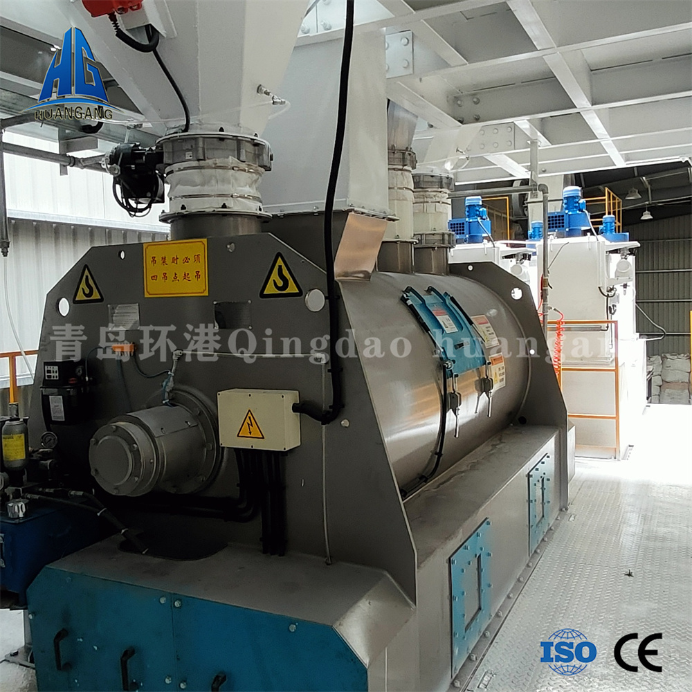 雙軸無重力混合機(jī)最大容積可達(dá)4000-8000L,雙軸轉(zhuǎn)速每分鐘55轉(zhuǎn),相比于單軸混合機(jī)攪拌容積比較大,適合更大產(chǎn)量的散裝物料生產(chǎn),能在180秒左右把計(jì)量好的砂子,水泥,石膏、粉煤灰、重鈣、灰鈣,外加劑等原材料充分翻合均勻,形成達(dá)到規(guī)定強(qiáng)度的成品物料,還使用了獨(dú)特的液壓開門結(jié)構(gòu),能使物料在10秒內(nèi)卸料完成,出料殘余少,并且我們的混合機(jī)出料口設(shè)有分料器,可根據(jù)需要控制成品物料是送往包裝機(jī)進(jìn)行袋裝或經(jīng)過干粉送料螺旋送到散裝頭進(jìn)行散裝。